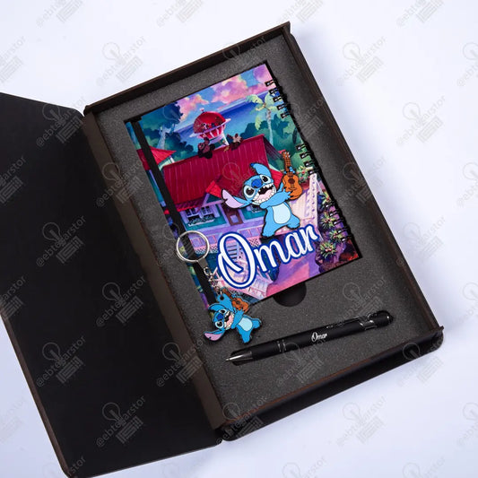 بوكس نوت بوك خشب (ديزاين الدبدوب) وقلم معدن وميدالية خشب