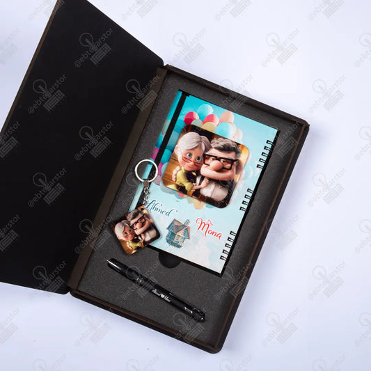 بوكس نوت بوك خشب (ديزاين UP) وقلم معدن وميدالية خشب