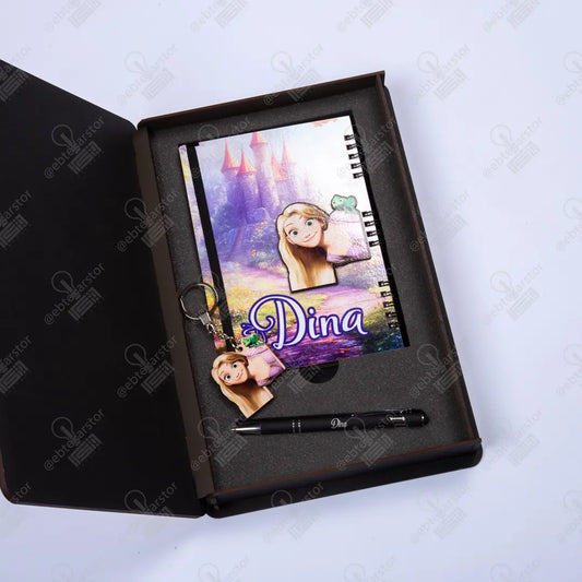 بوكس نوت بوك خشب (ديزاين رابانزل) وقلم معدن وميدالية خشب