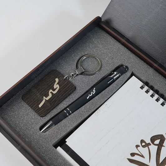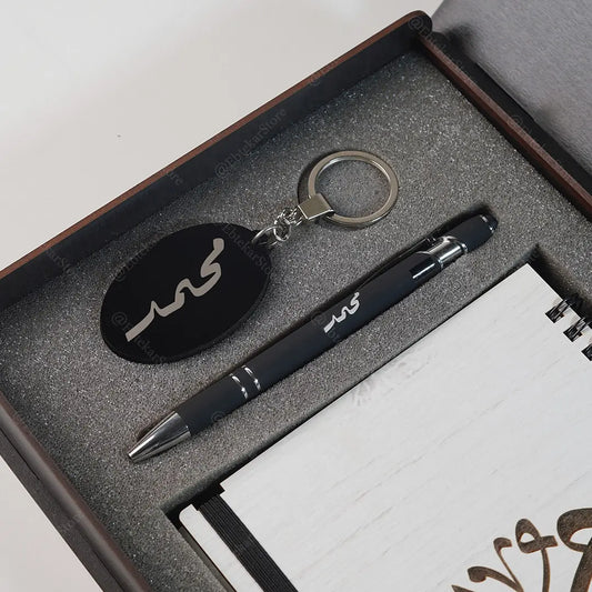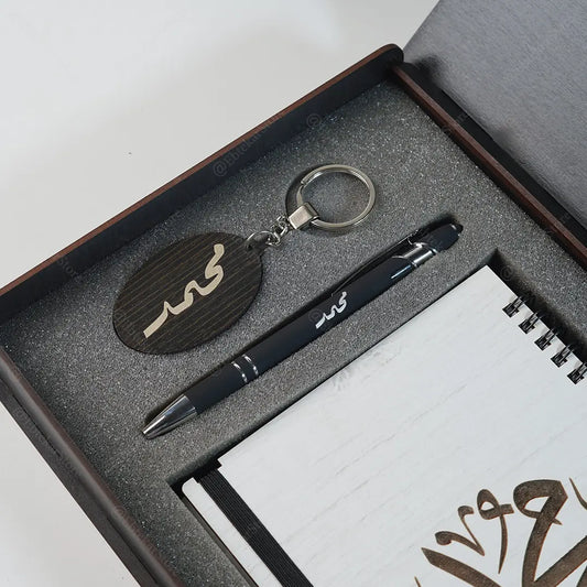 بوكس نوت بوك خشب تلجي وقلم معدن وميدالية اكريليك بيضاوية
