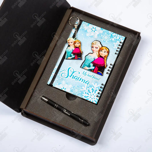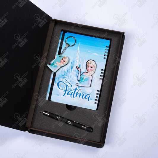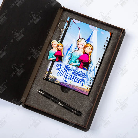 بوكس نوت بوك خشب (ديزاين فروزن كود 1) وقلم معدن وميدالية خشب