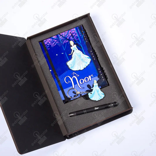 بوكس نوت بوك خشب (ديزاين سندريلا) وقلم معدن وميدالية خشب