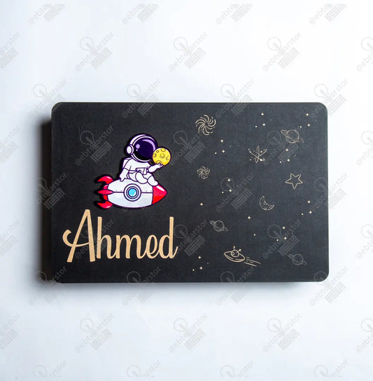 بوكس نوت بوك خشب (ديزاين رجل الفضاء) وقلم معدن وميدالية خشب