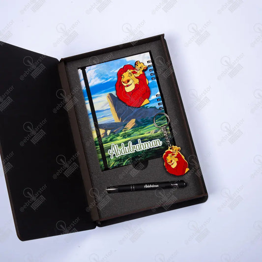 بوكس نوت بوك خشب (ديزاين سيمبا) وقلم معدن وميدالية خشب