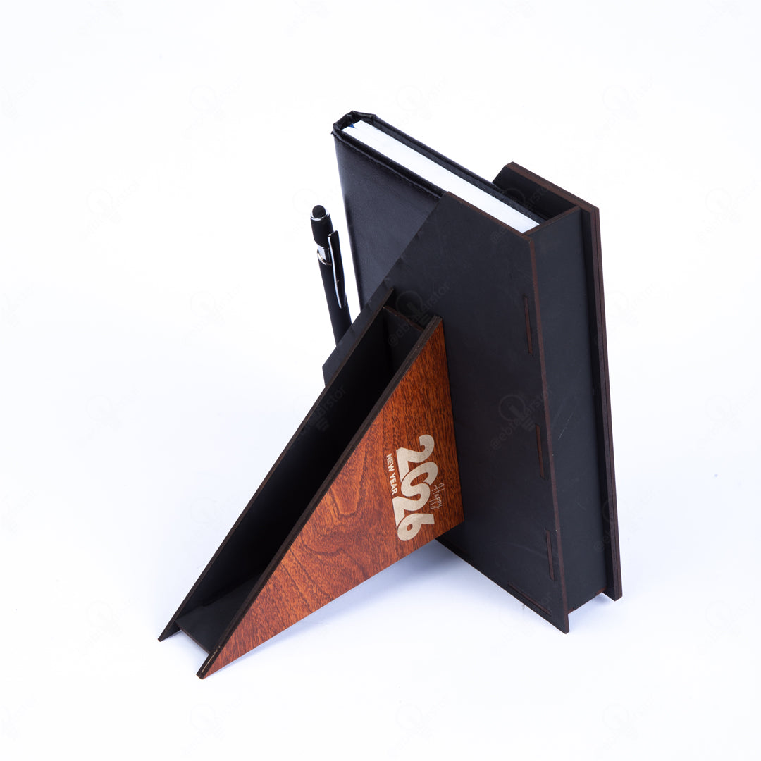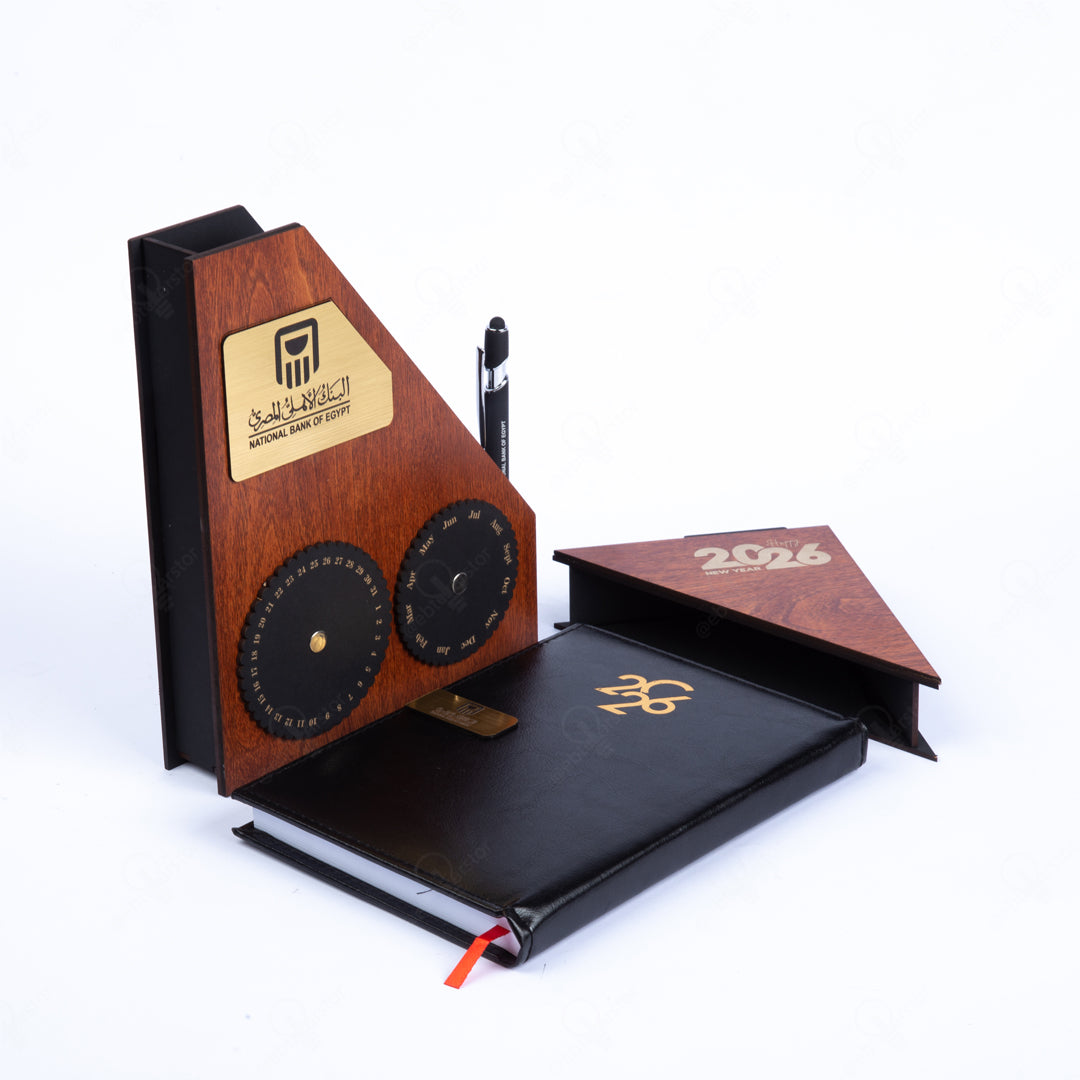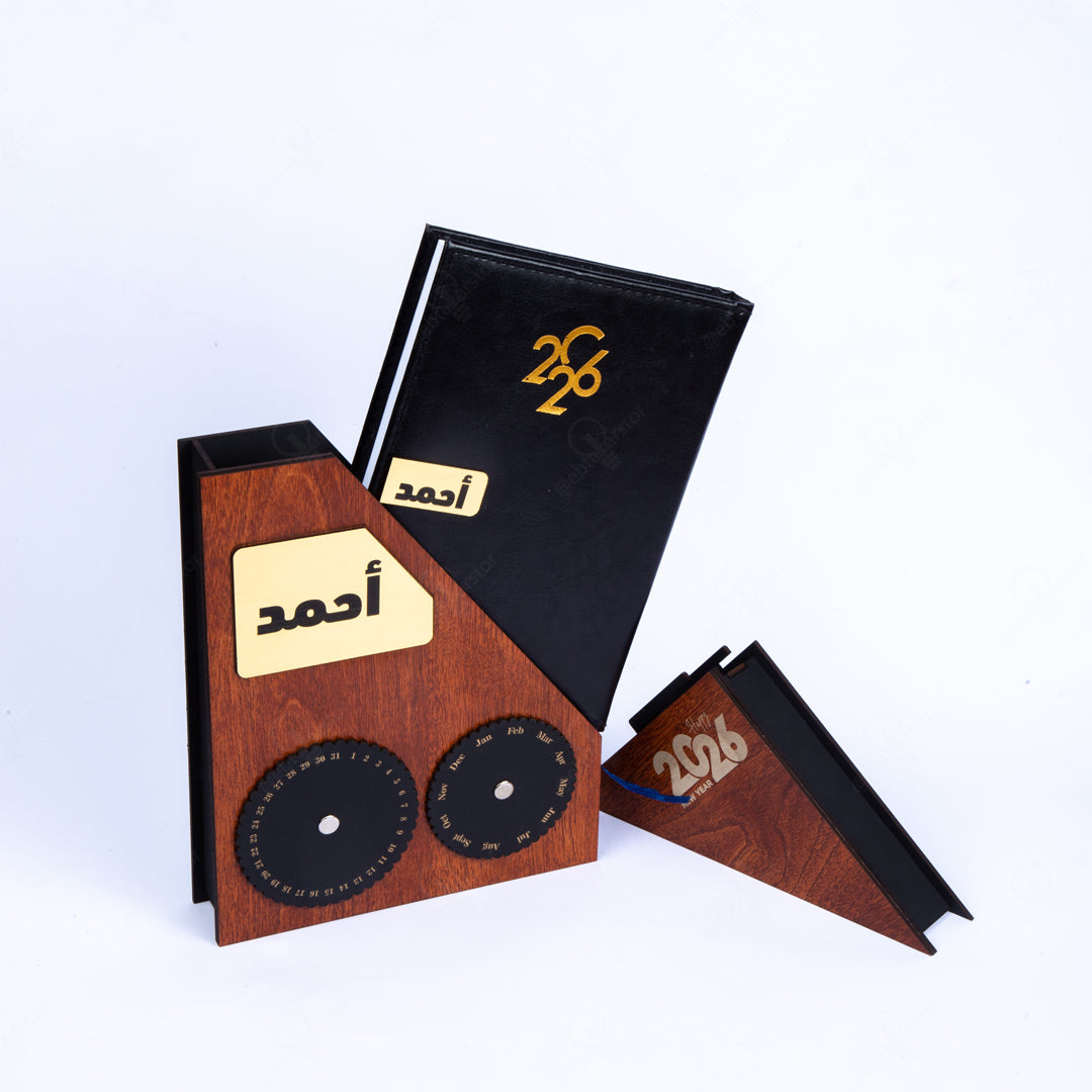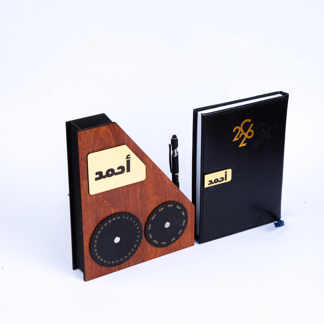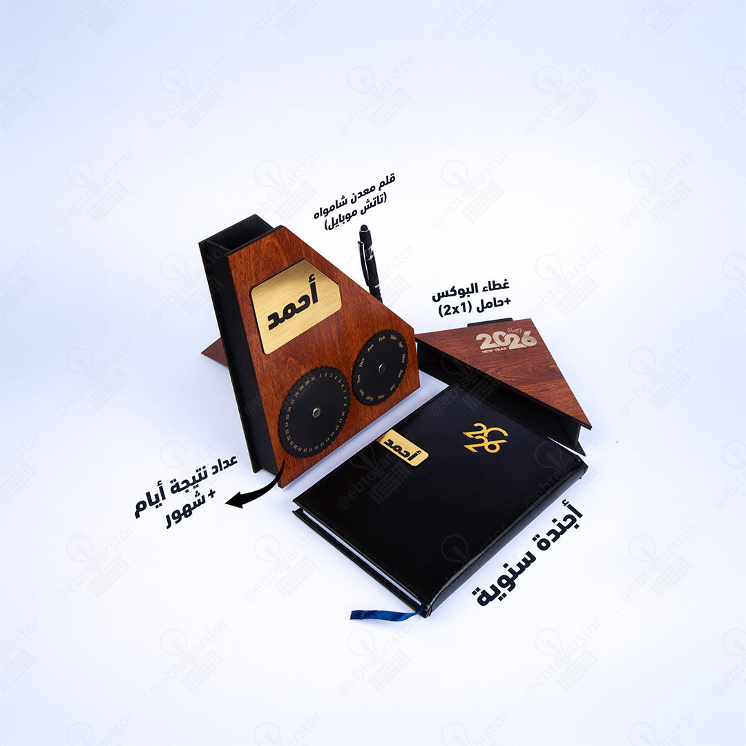 -منظم شيك: هو مش مجرد بوكس، ده حامل خشبي شكله قيم جداً، بيخلي الأجندة والقلم في مكان واحد ومنظم.