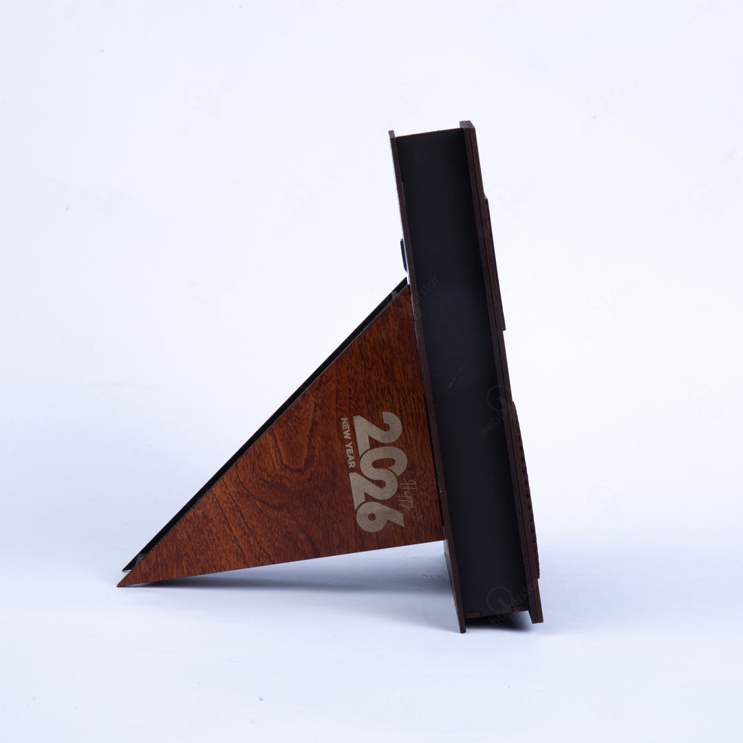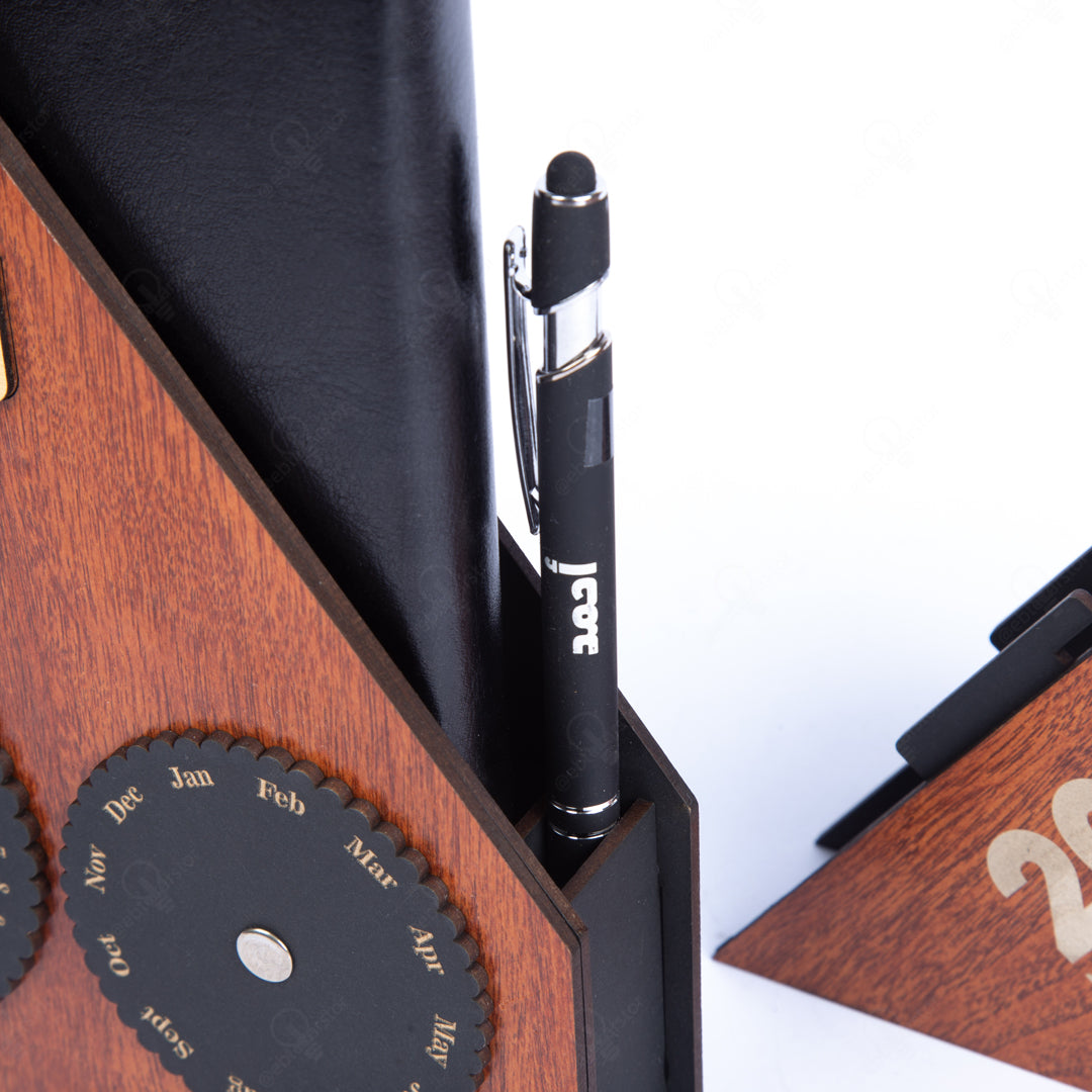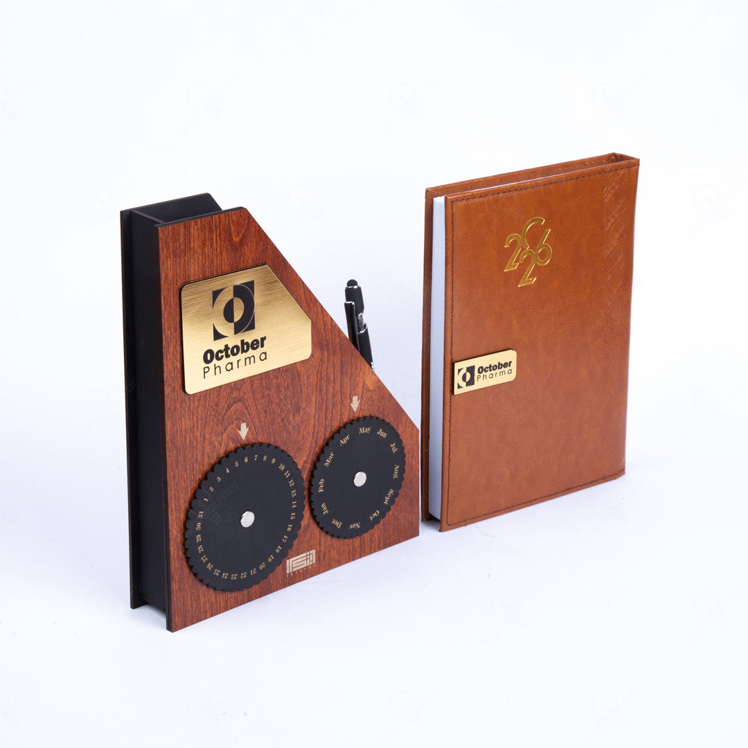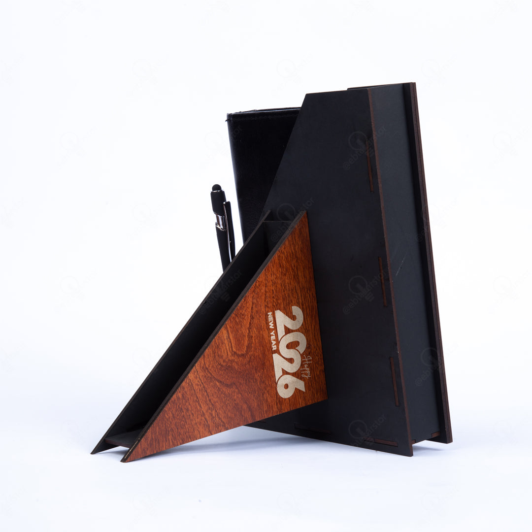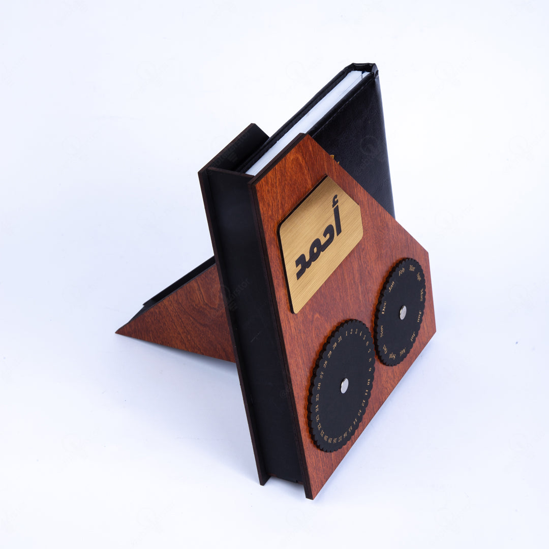 -منظم شيك: هو مش مجرد بوكس، ده حامل خشبي شكله قيم جداً، بيخلي الأجندة والقلم في مكان واحد ومنظم.