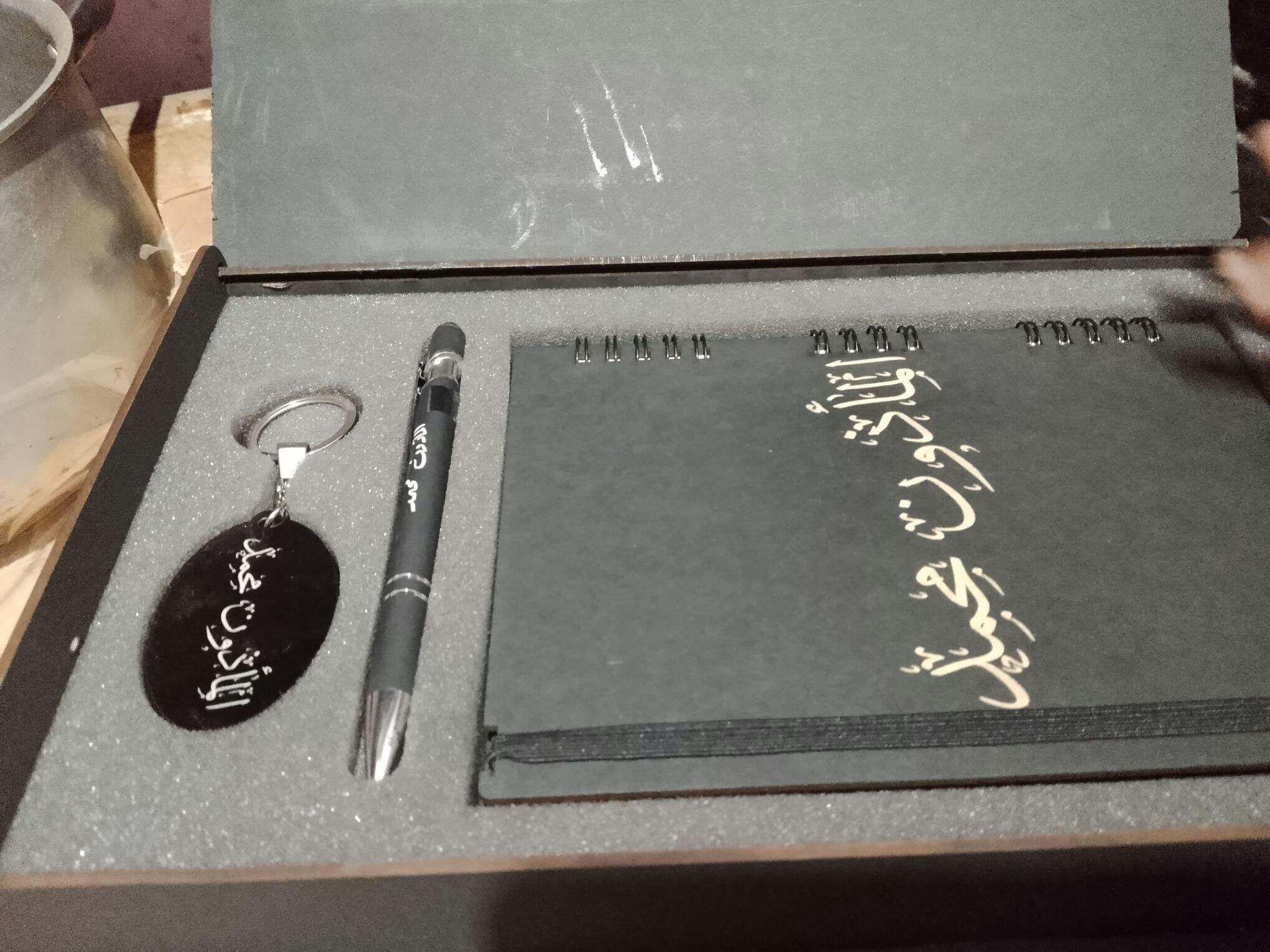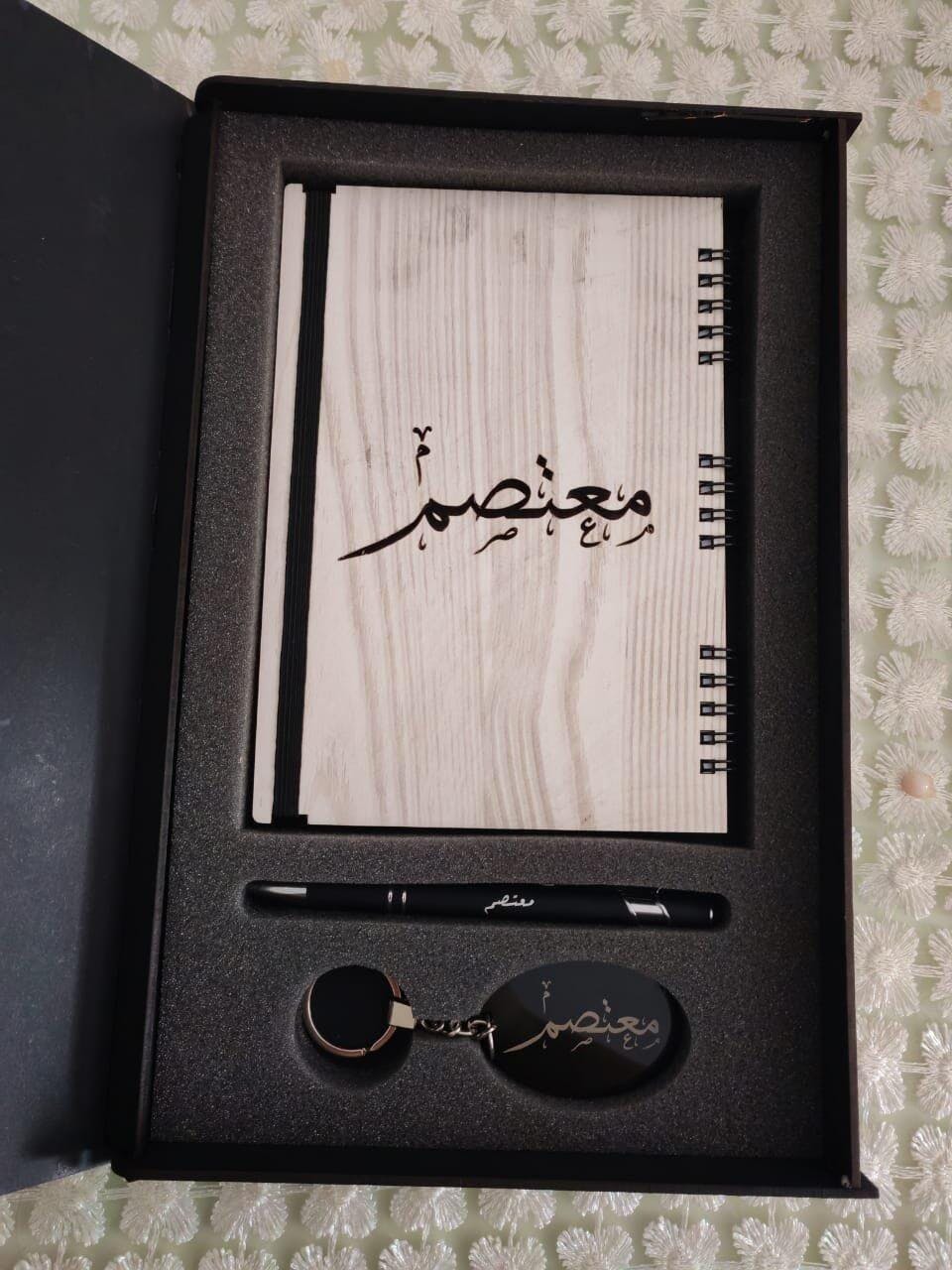 بوكس الهدايا ده هو الاختيار الأمثل! البوكس ده بيجمعلك 3 قطع تحفة: نوت بوك خشب شيك جداً بتصميم مميز وبسيط، ومعاه قلم معدن فخم عشان تكمل الأناقة وكمان تقدر تستخدمه لتاتش الموبايل، وكمان ميدالية أكريليك أنيقة عشان تبقى معاه في كل مكان.
