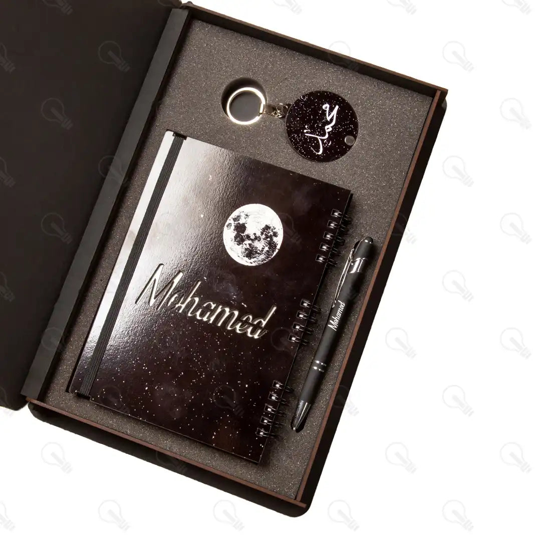 بوكس الهدايا ده هو الاختيار الأمثل! البوكس ده بيجمعلك 3 قطع تحفة: نوت بوك خشب شيك جداً بتصميم مميز وبسيط، ومعاه قلم معدن فخم عشان تكمل الأناقة وكمان تقدر تستخدمه لتاتش الموبايل، وكمان ميدالية خشب طبقتين أنيقة عشان تبقى معاه في كل مكان.