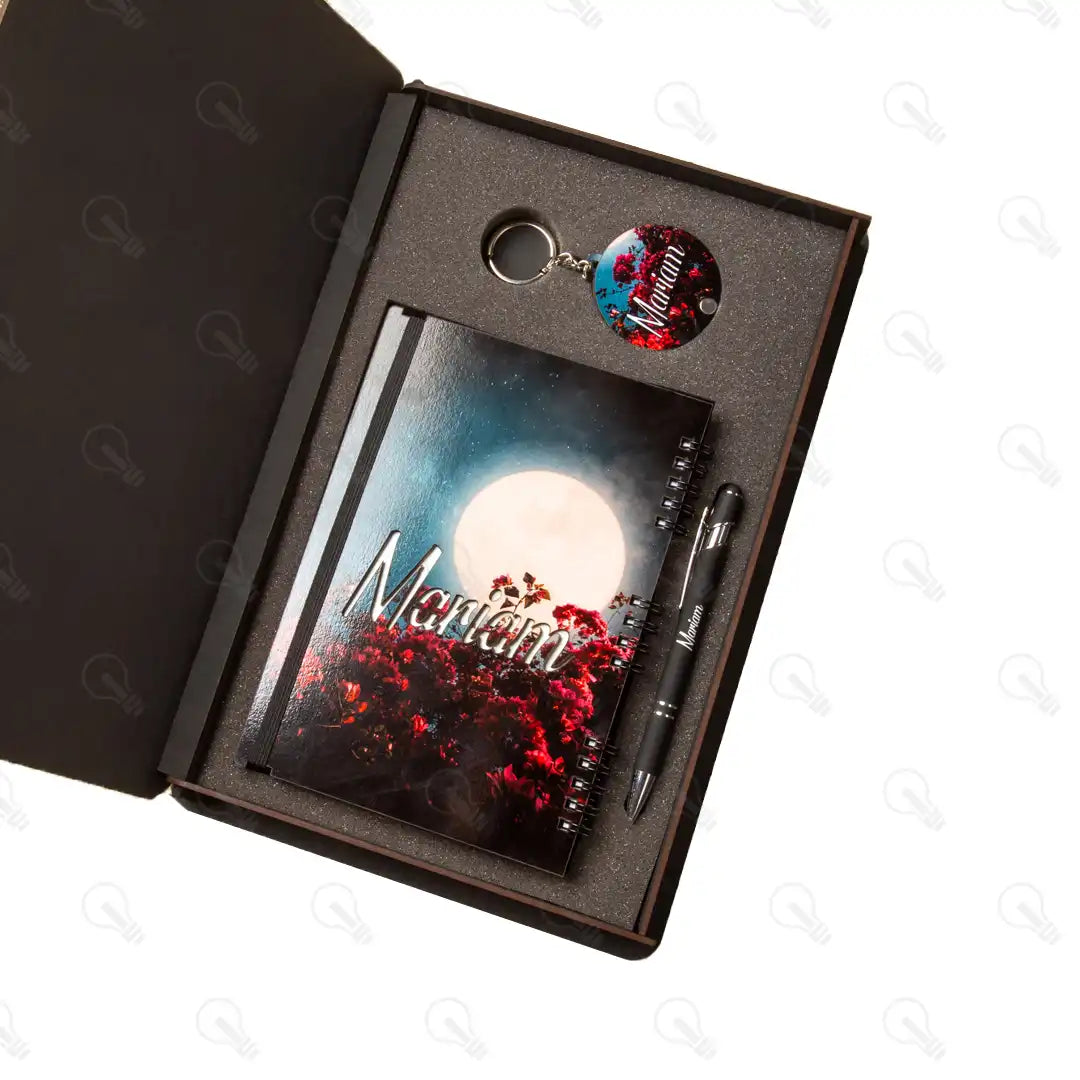 بوكس الهدايا ده هو الاختيار الأمثل! البوكس ده بيجمعلك 3 قطع تحفة: نوت بوك خشب شيك جداً بتصميم مميز وبسيط، ومعاه قلم معدن فخم عشان تكمل الأناقة وكمان تقدر تستخدمه لتاتش الموبايل، وكمان ميدالية خشب طبقتين أنيقة عشان تبقى معاه في كل مكان.