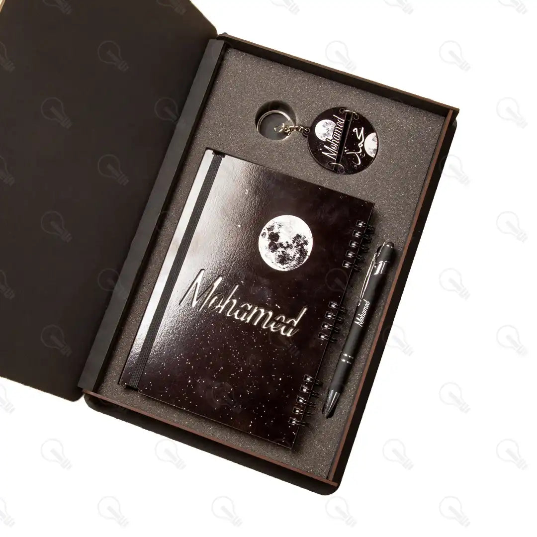 بوكس الهدايا ده هو الاختيار الأمثل! البوكس ده بيجمعلك 3 قطع تحفة: نوت بوك خشب شيك جداً بتصميم مميز وبسيط، ومعاه قلم معدن فخم عشان تكمل الأناقة وكمان تقدر تستخدمه لتاتش الموبايل، وكمان ميدالية خشب نصين أنيقة عشان تبقى معاه في كل مكان.
