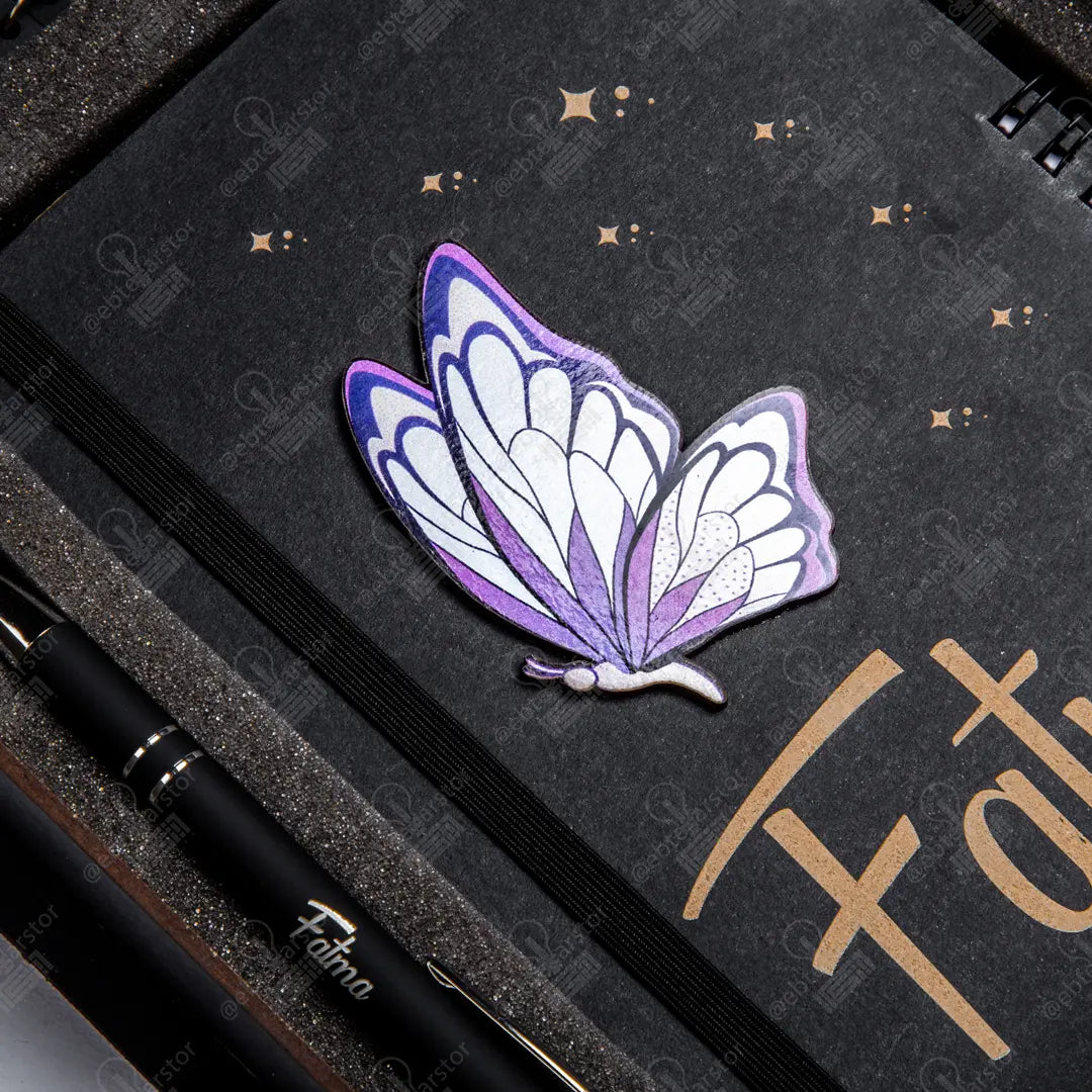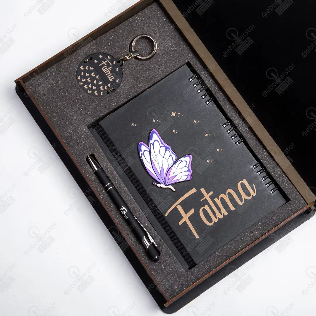 بوكس نوت بوك خشب (ديزاين الفراشة) وقلم معدن وميدالية خشب نصفين