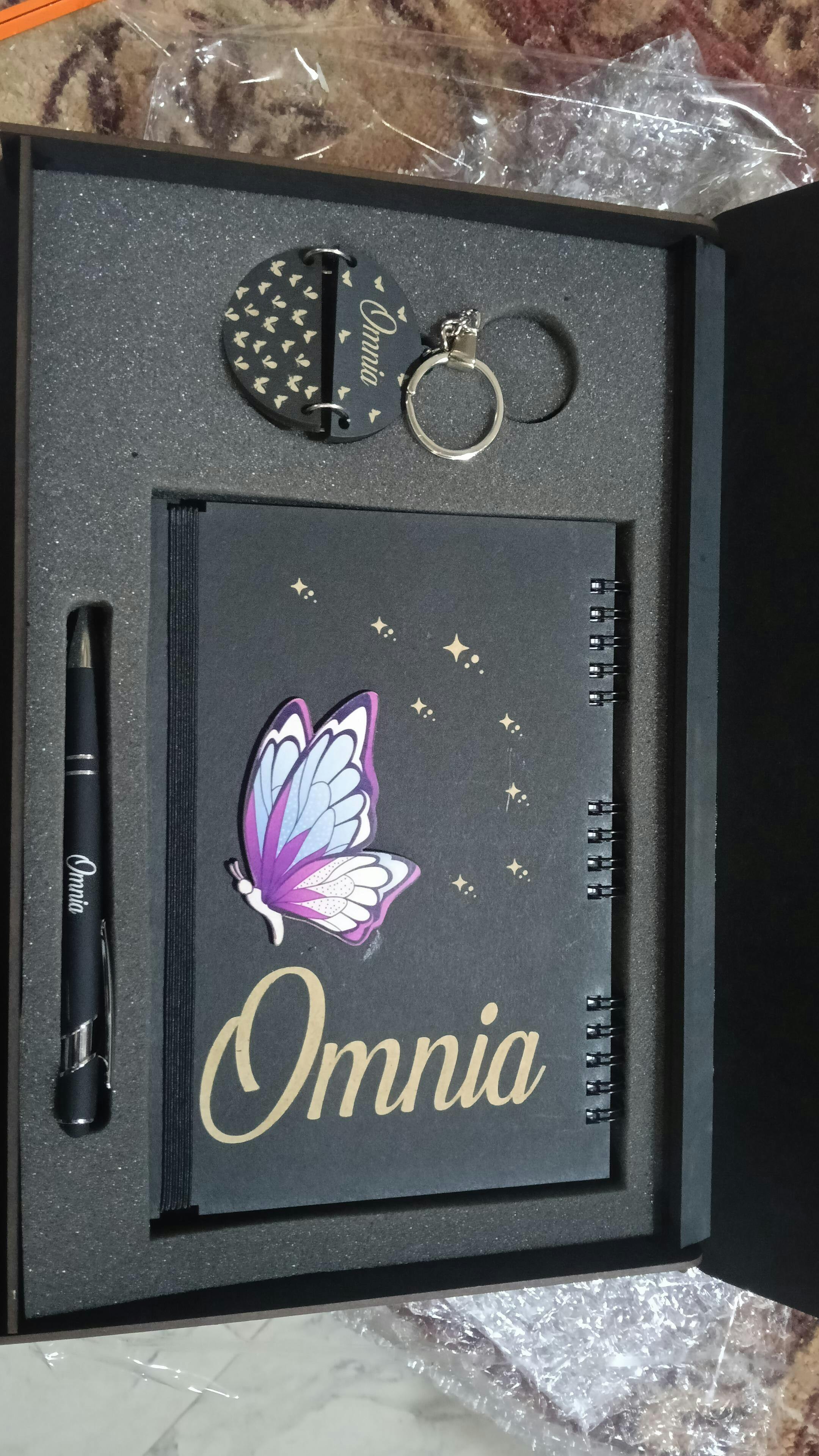 بوكس نوت بوك خشب (ديزاين الفراشة) وقلم معدن وميدالية خشب نصفين