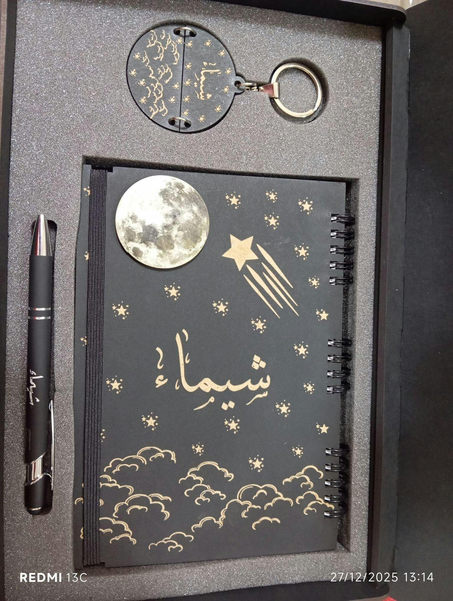 بوكس نوت بوك خشب (ديزاين القمر كود 2) وقلم معدن وميدالية خشب نصفين