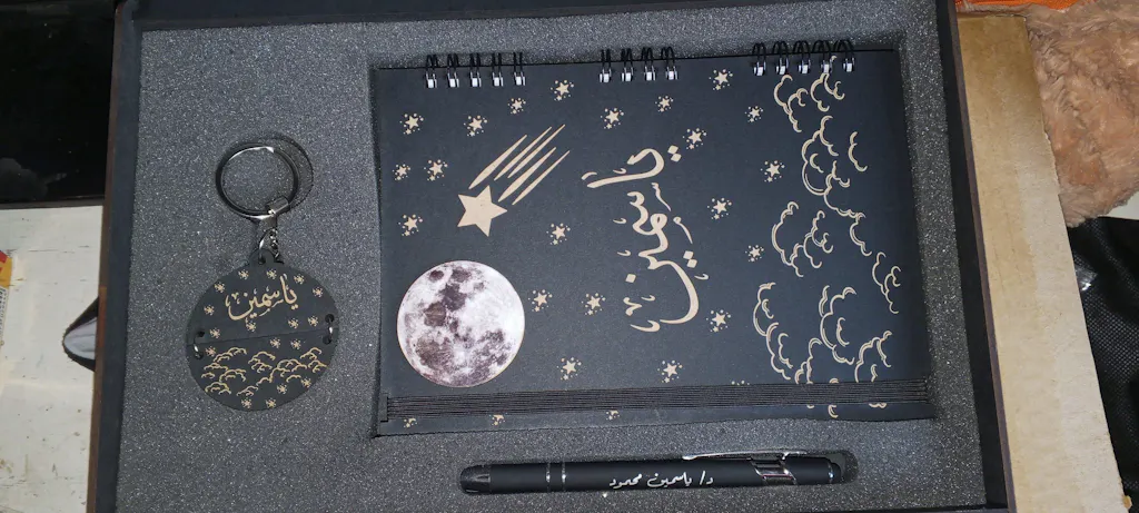 بوكس الهدية ده هو الاختيار الأمثل! البوكس ده بيجمعلك 3 قطع تحفة: نوت بوك خشب شيك جداً بتصميم مميز يفتح النفس، ومعاه قلم معدن فخم عشان تكمل الأناقة وكمان بتستخدمه تاتش للموبايل، وكمان ميدالية خشب بنفس تصميم البوكس والنوت عشان تبقى معاه في كل مكان.