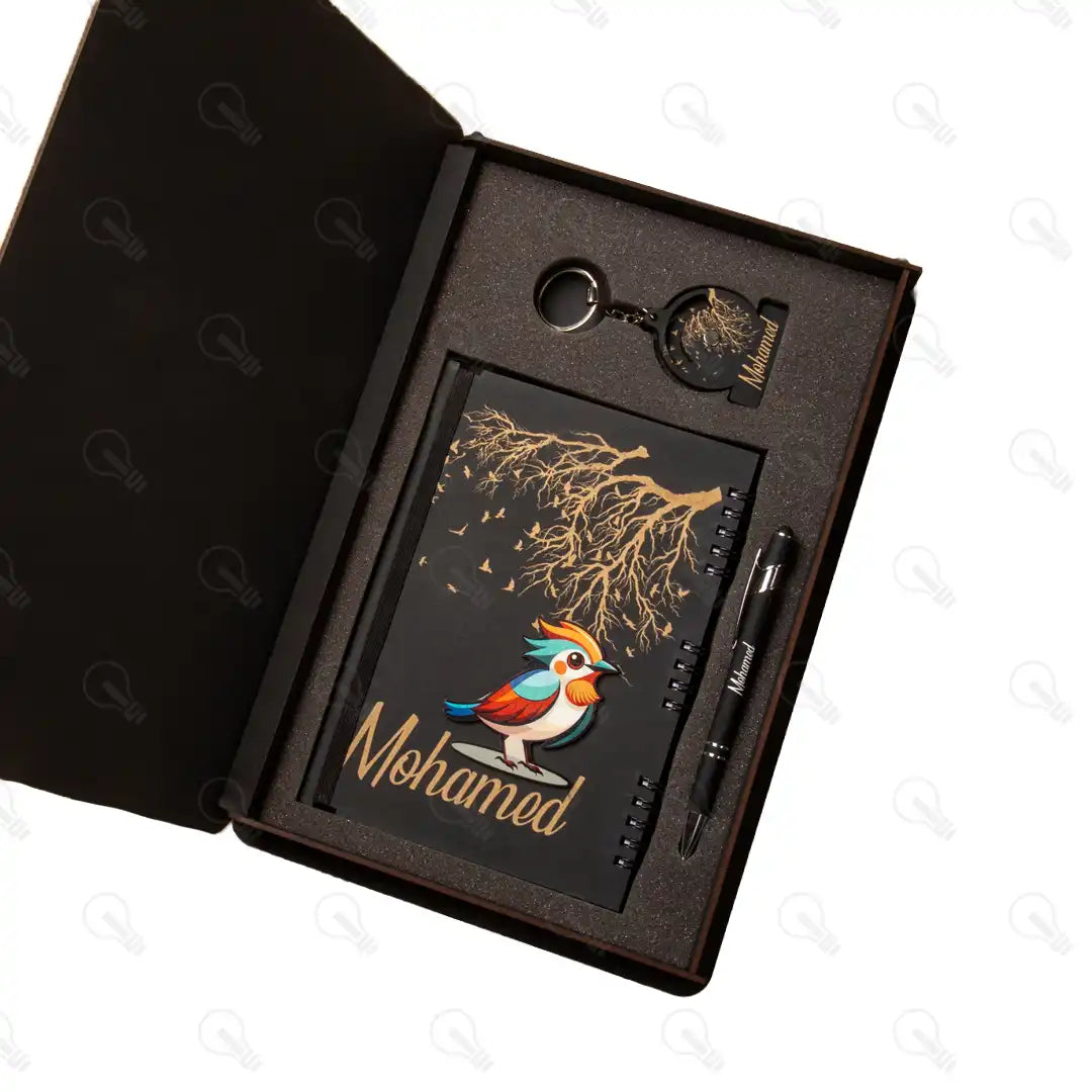 بوكس الهدايا ده هو الاختيار الأمثل! البوكس ده بيجمعلك 3 قطع تحفة: نوت بوك خشب شيك جداً بتصميم مميز وبسيط، ومعاه قلم معدن فخم عشان تكمل الأناقة وكمان تقدر تستخدمه لتاتش الموبايل، وكمان ميدالية خشب طبقتين أنيقة عشان تبقى معاه في كل مكان.
