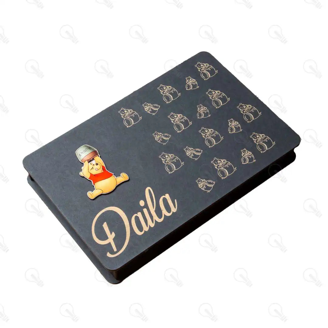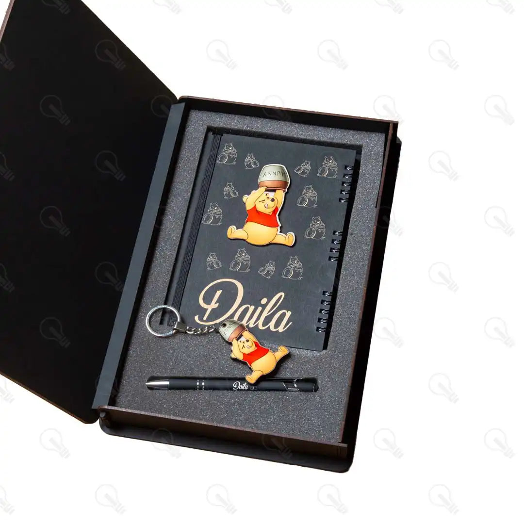 بوكس نوت بوك خشب (ديزاين ويني) وقلم معدن وميدالية خشب
