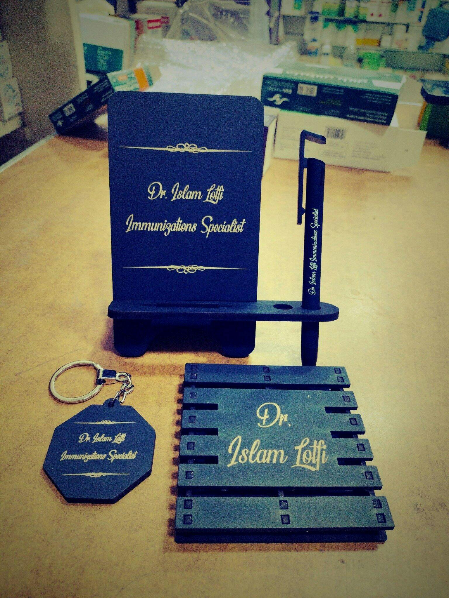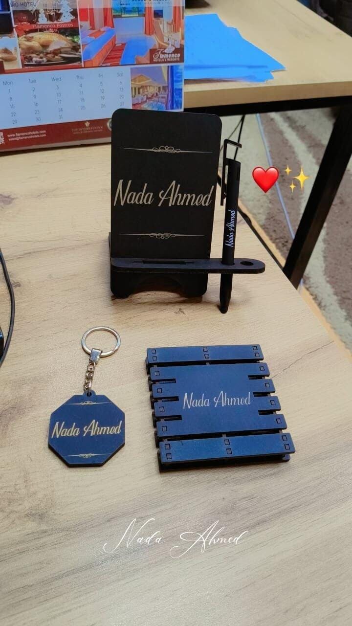 المحتويات : ستاند موبايل - كوستر خشب مجسم - ميدالية خشب - قلم معدن