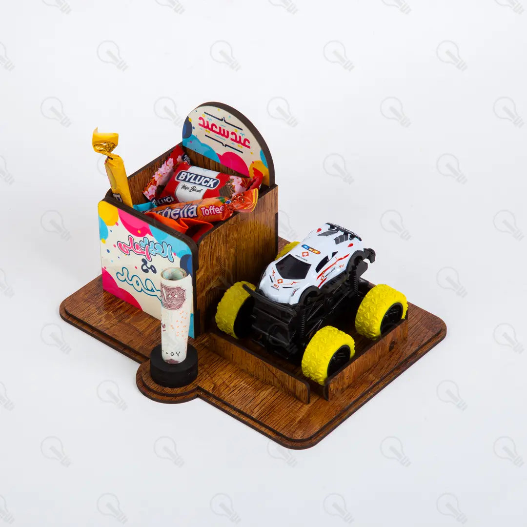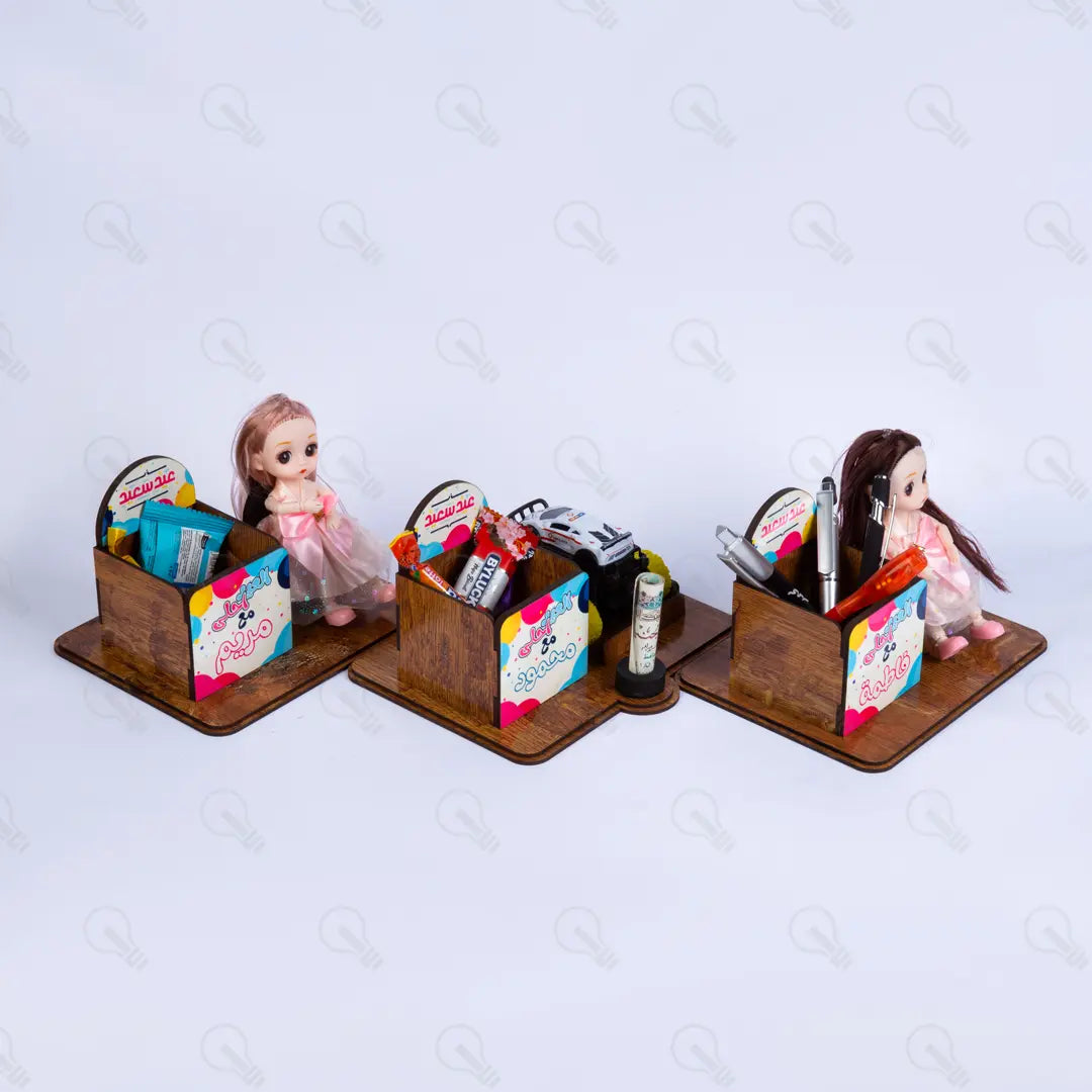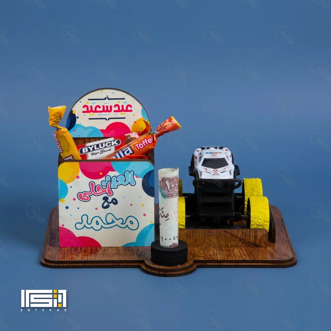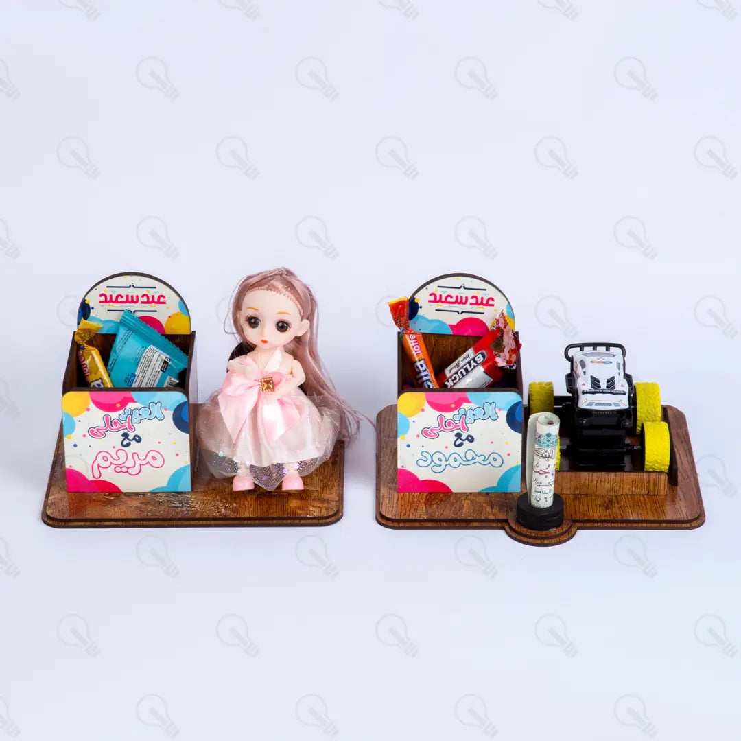 السنادي العيدية مش بس ورقة بفلوس، السنادي العيدية هي "ستاند إبتكار" اللي هيخطف أنظار ولادك وهيخلي يومهم كله سعادة. تخيلي فرحة بنتك وهي بتستلم العروسة الرقيقة اللي شايلة العيدية في إيديها، أو انبهار ابنك بالعربية الجبارة اللي واقفة بكل فخامة وجنبها مكان مخصص للعيدية. الستاند مصنوع من أجود أنواع الخشب بتصميم "مقلمة" شيك جداً ومطبوع بألوان زاهية ومبهجة، والأهم من كل ده إننا بنطبع اسم طفلك أو جملة إهداء مخصوصة على الستاند عشان يحس إنه بطل العيد الحقيقي.