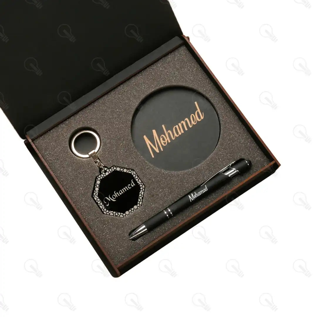 بوكس الهدايا ده هو الاختيار الأمثل! البوكس ده بيجمعلك قطع تحفة: قلم معدن فخم بخط سلس في الكتابة وبيسنخدم كتاتش للموبايل كمان، ومعاه كوستر خشب وميدالية اكريليك تكمل هديتك عشان تكون شيك وعملية ومناسبة لاي شخص تقدمهاله.
