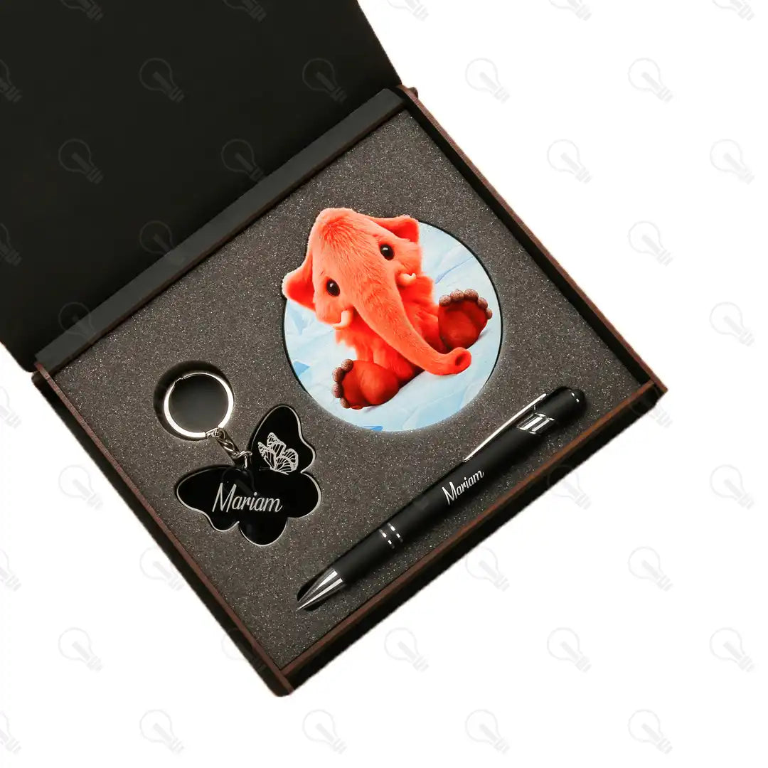 بوكس قلم معدن وكوستر خشب وميدالية اكريليك (ديزاين الفيل)