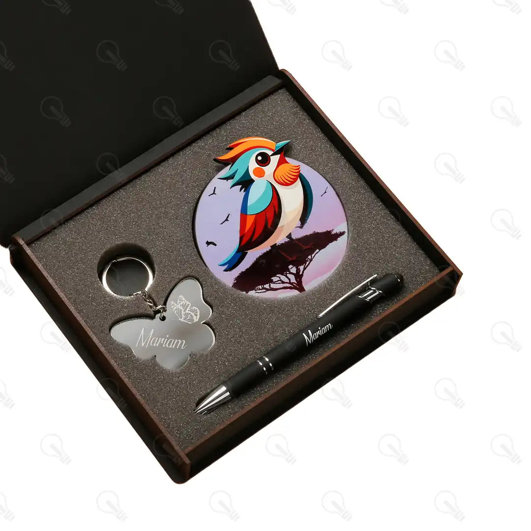 بوكس الهدايا ده هو الاختيار الأمثل! البوكس ده بيجمعلك قطع تحفة: قلم معدن فخم بخط سلس في الكتابة وبيسنخدم كتاتش للموبايل كمان، ومعاه كوستر خشب وميدالية اكريليك تكمل هديتك عشان تكون شيك وعملية ومناسبة لاي شخص تقدمهاله.