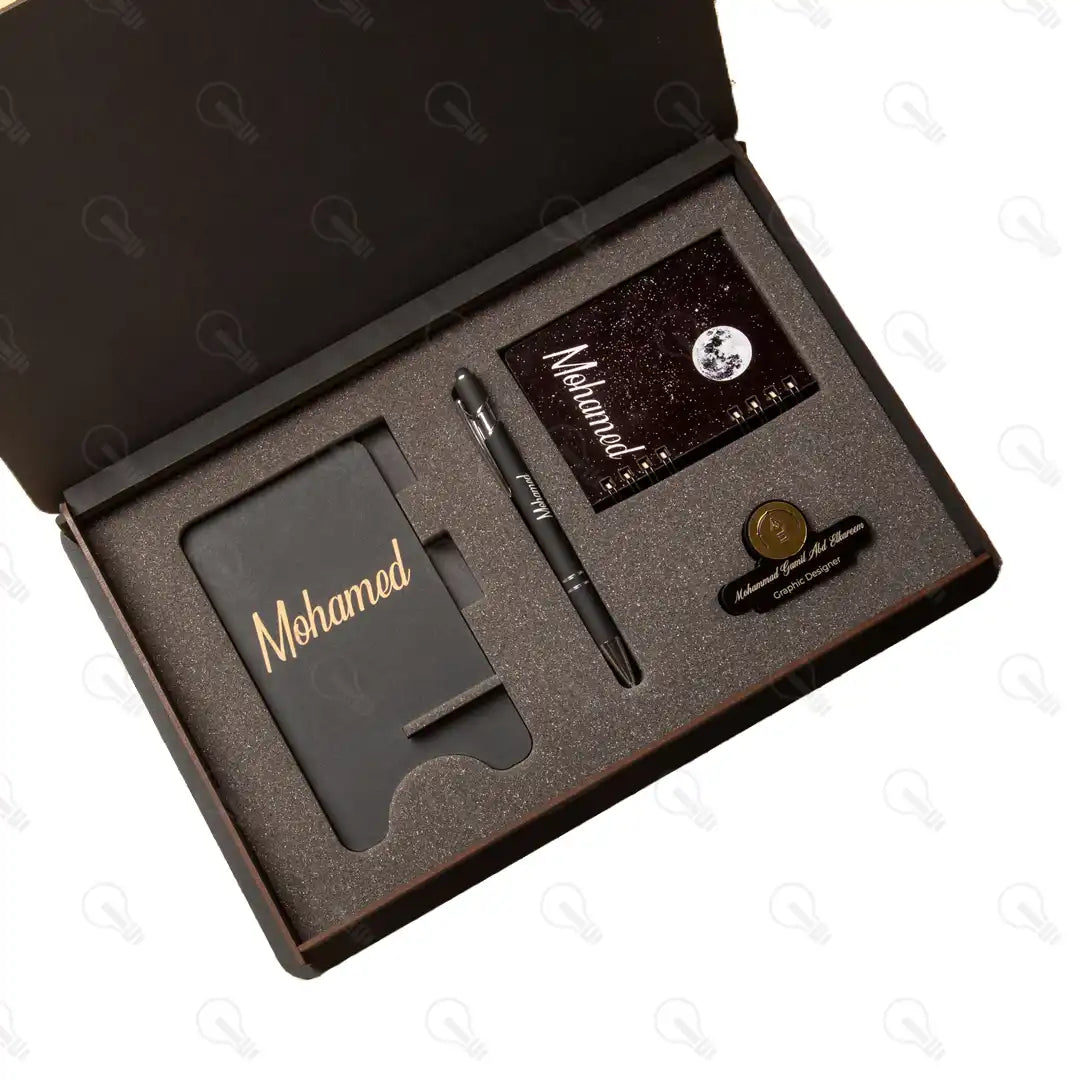 بوكس الهدايا ده هو الاختيار الأمثل! البوكس ده بيجمعلك قطع تحفة: قلم معدن فخم بخط سلس في الكتابة وبيسنخدم كتاتش للموبايل كمان، ومعاه ستاند للموبايل بشكل شيك ومميز وفيه مكان للاقلام وفتحة للشاحن عشان يسهل عليك استخدام الموبايل علي مكتبك ، وكمان معاه نوت ميني ونيم تاج شيك تكمل الهدية.