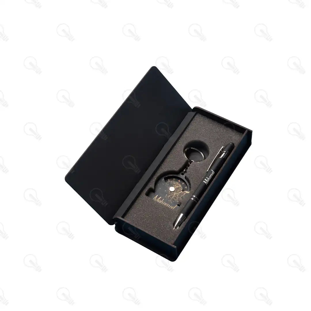بوكس (ديزاين الشجر) قلم معدن وميدالية خشب طبقتين
