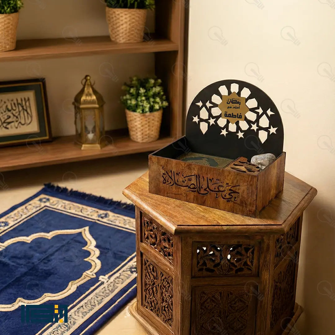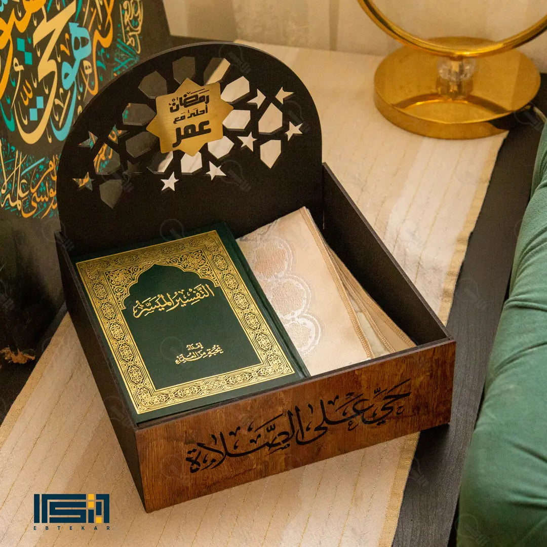 البوكس بيجي بتصميم خشبي فخم عليه عبارة "حي على الصلاة" و"رمضان أحلى مع (اسمك)"، وده يخليه القطعة الأنسب لتنظيم ركن العبادة في بيتك أو كهدية قيمة جداً لحد غالي عليك.