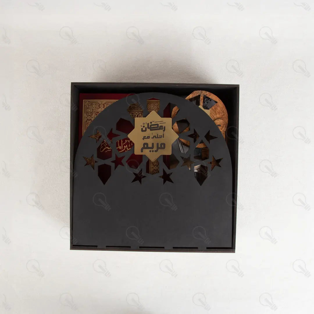 تقدر تخلي هديتك مميزة جداً بحفر اسم الشخص اللي بتحبه على نجمة ذهبية أنيقة بتزين البوكس. جملة "رمضان أحلى مع" بتتحفر بدقة ليزر عالية، وده بيخليها هدية شخصية وليها قيمة كبيرة عند اللي هيستلمها، ومناسبة جداً لكل أفراد العيلة.