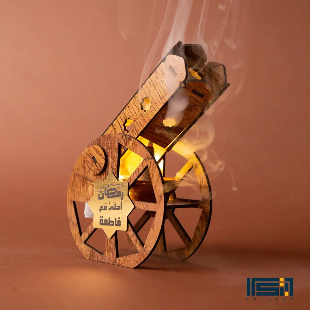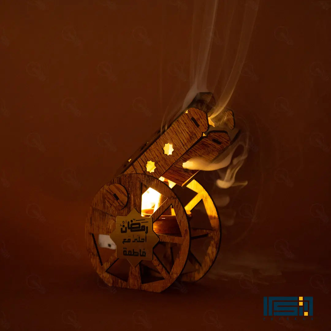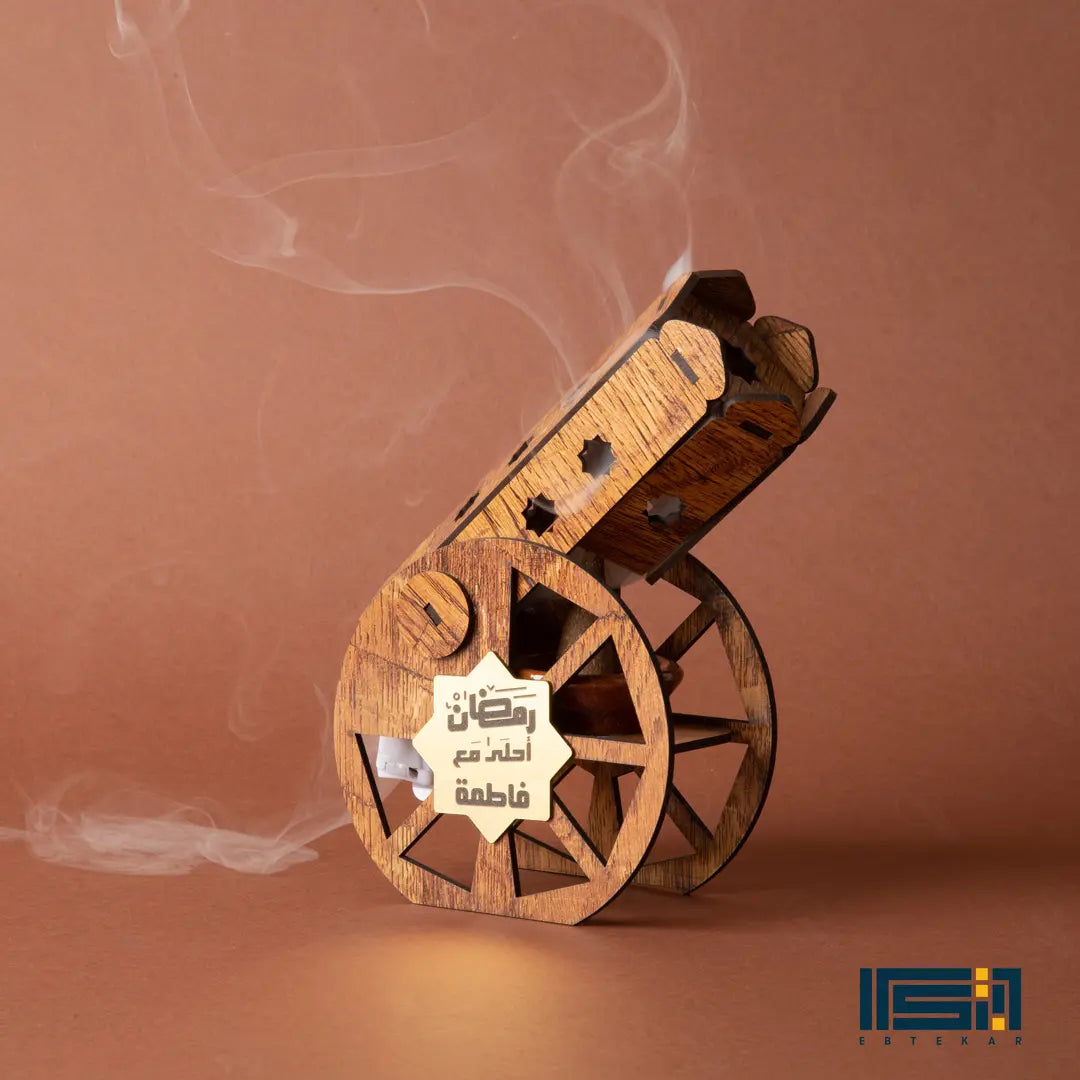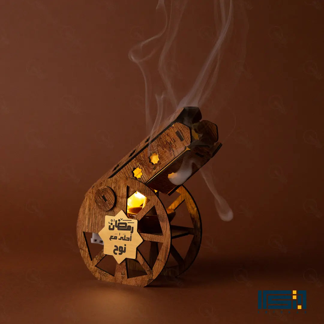المدفع ده هيغنيكِ عن المباخر التقليدية؛ لأنه قطعة ديكور خشبية شيك جداً بتزين بيتك، وفي نفس الوقت هو مبخرة عملية فيها طبق فخار داخلي بيتحمل الحرارة. المدفع بيجي معاه بخور الأقماع الخاص بيه عشان يملى بيتك بريحة رمضان من أول دقيقة.