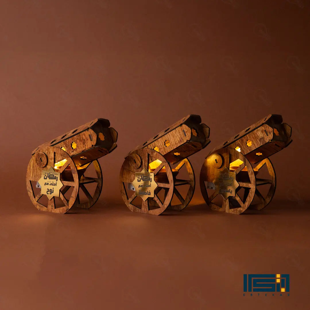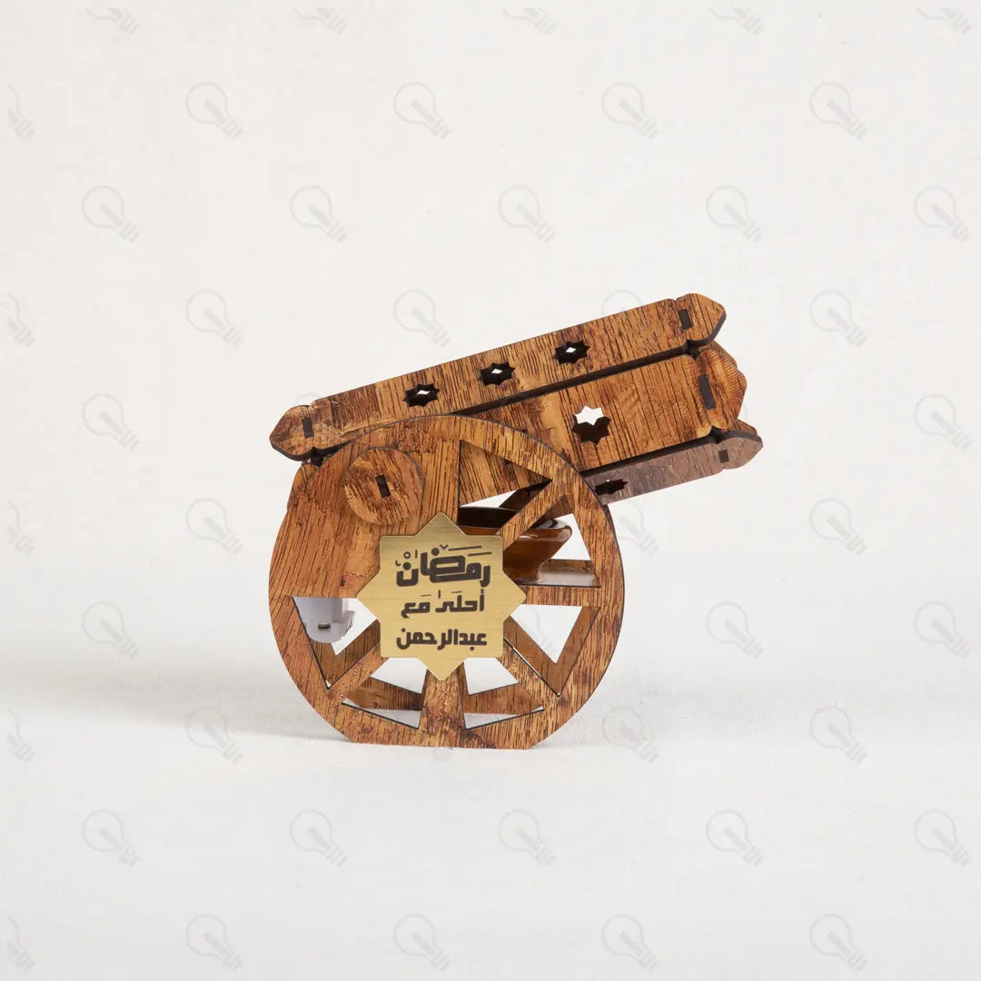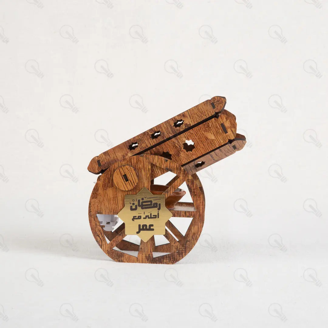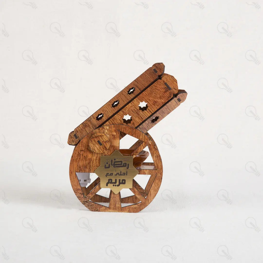تقدر تخلي هديتك مميزة جداً بحفر اسم الشخص اللي بتحبه على نجمة ذهبية أنيقة في قلب المدفع. جملة "رمضان أحلى مع" بتتحفر بدقة ليزر عالية، وده بيخليها هدية شخصية وليها قيمة كبيرة عند اللي هيستلمها، ومناسبة جداً لكل أفراد العيلة.
